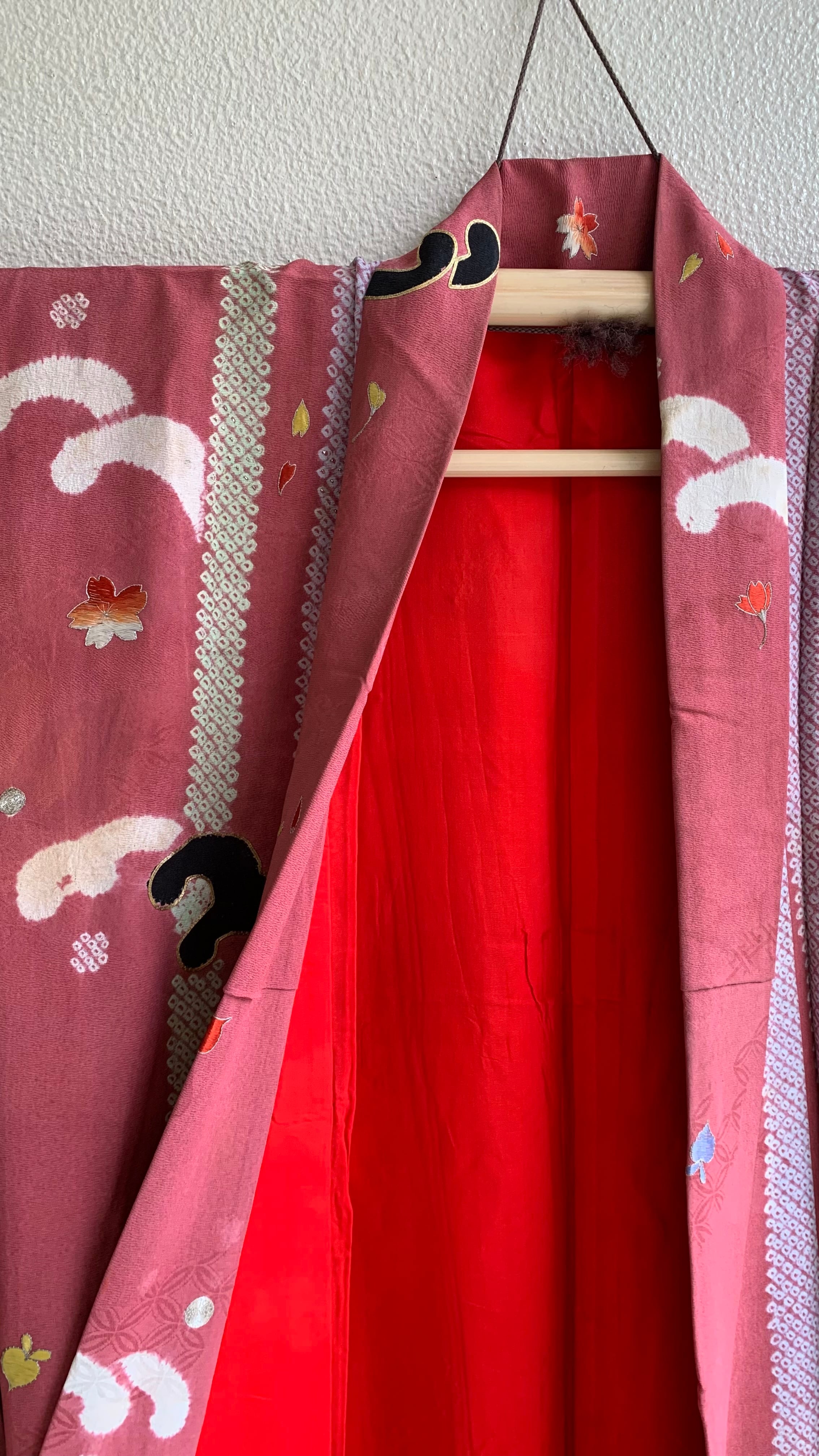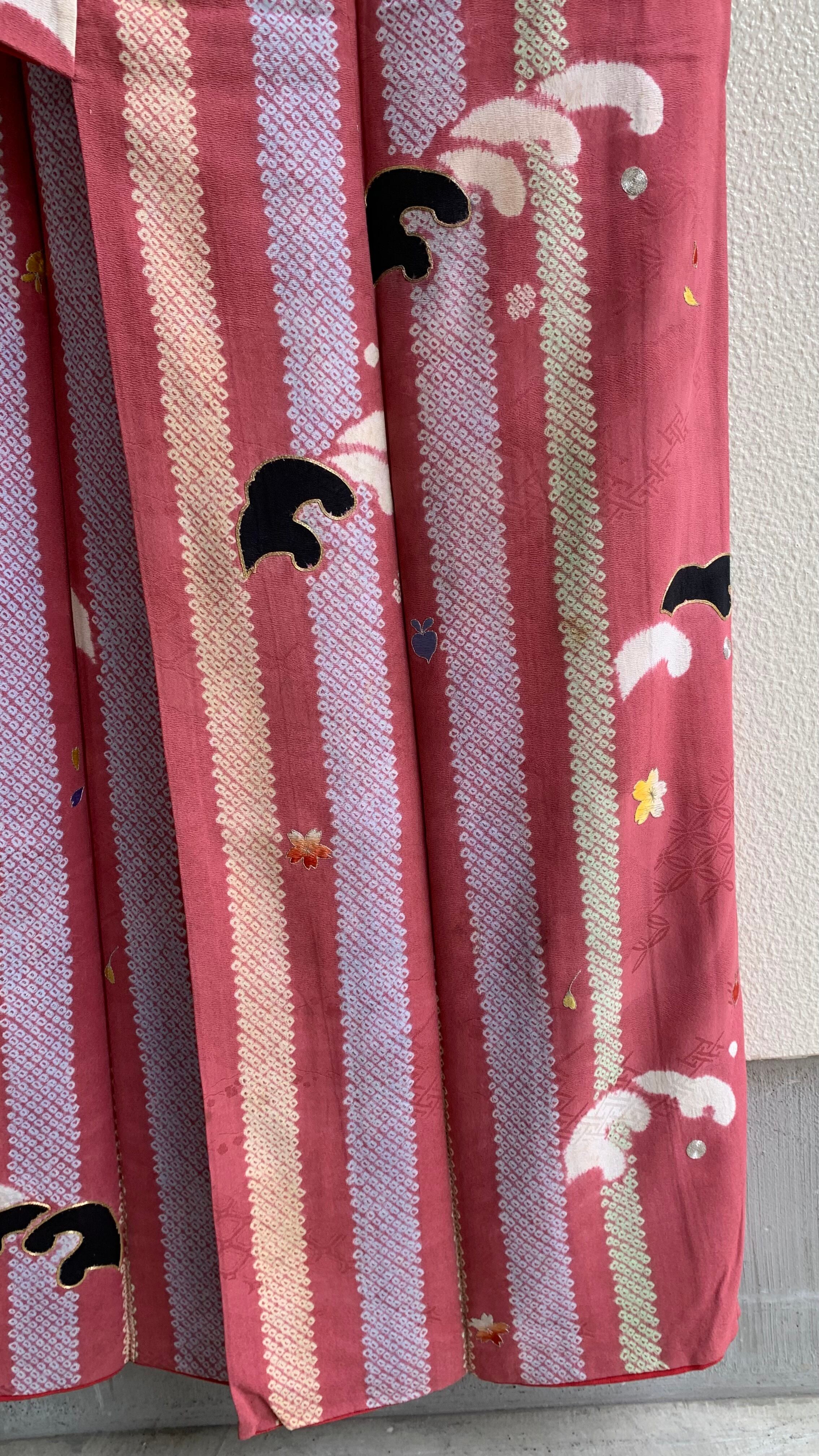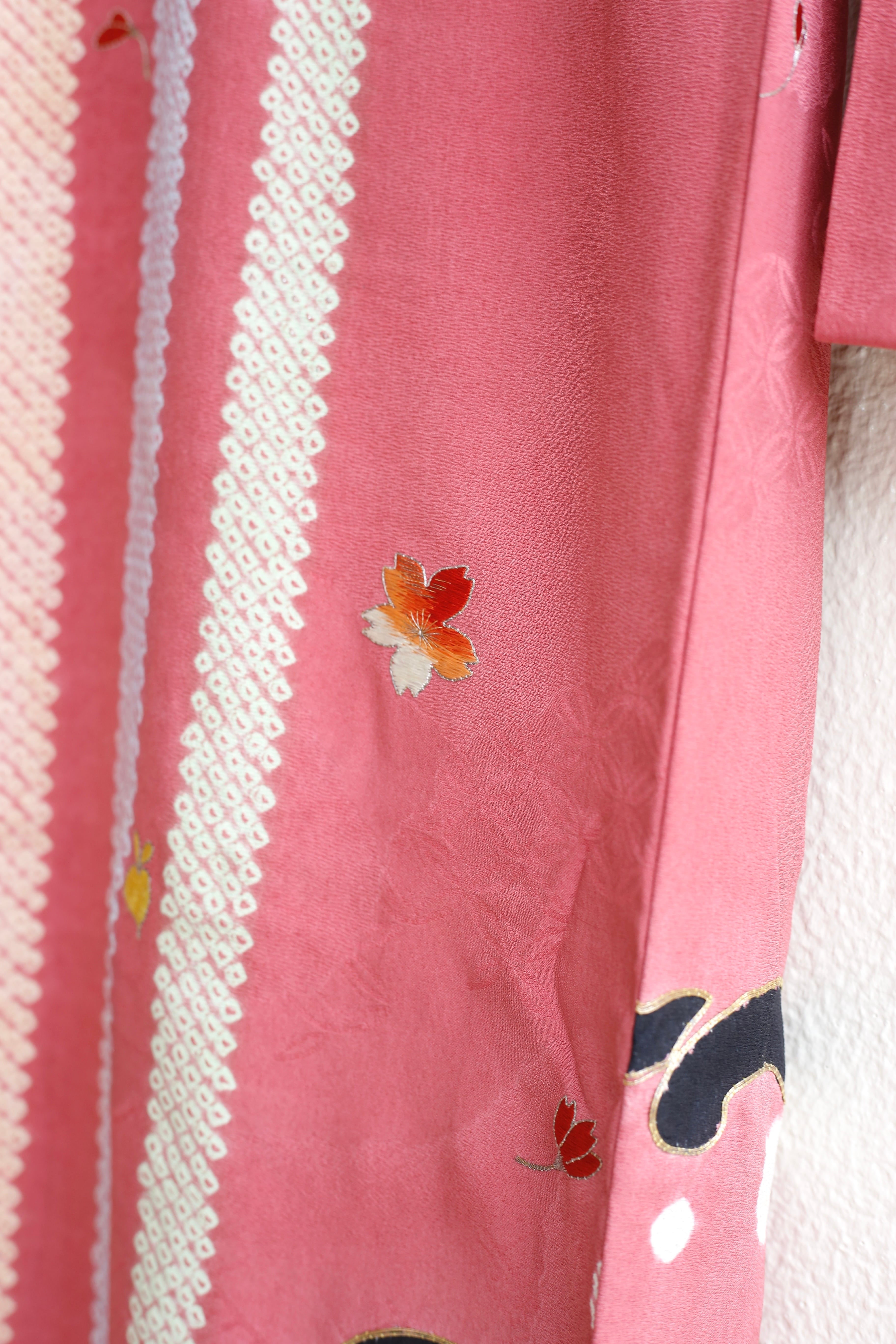 〈アンティーク着物〉桜 波 ピンク 刺繍 絞り 縦縞
