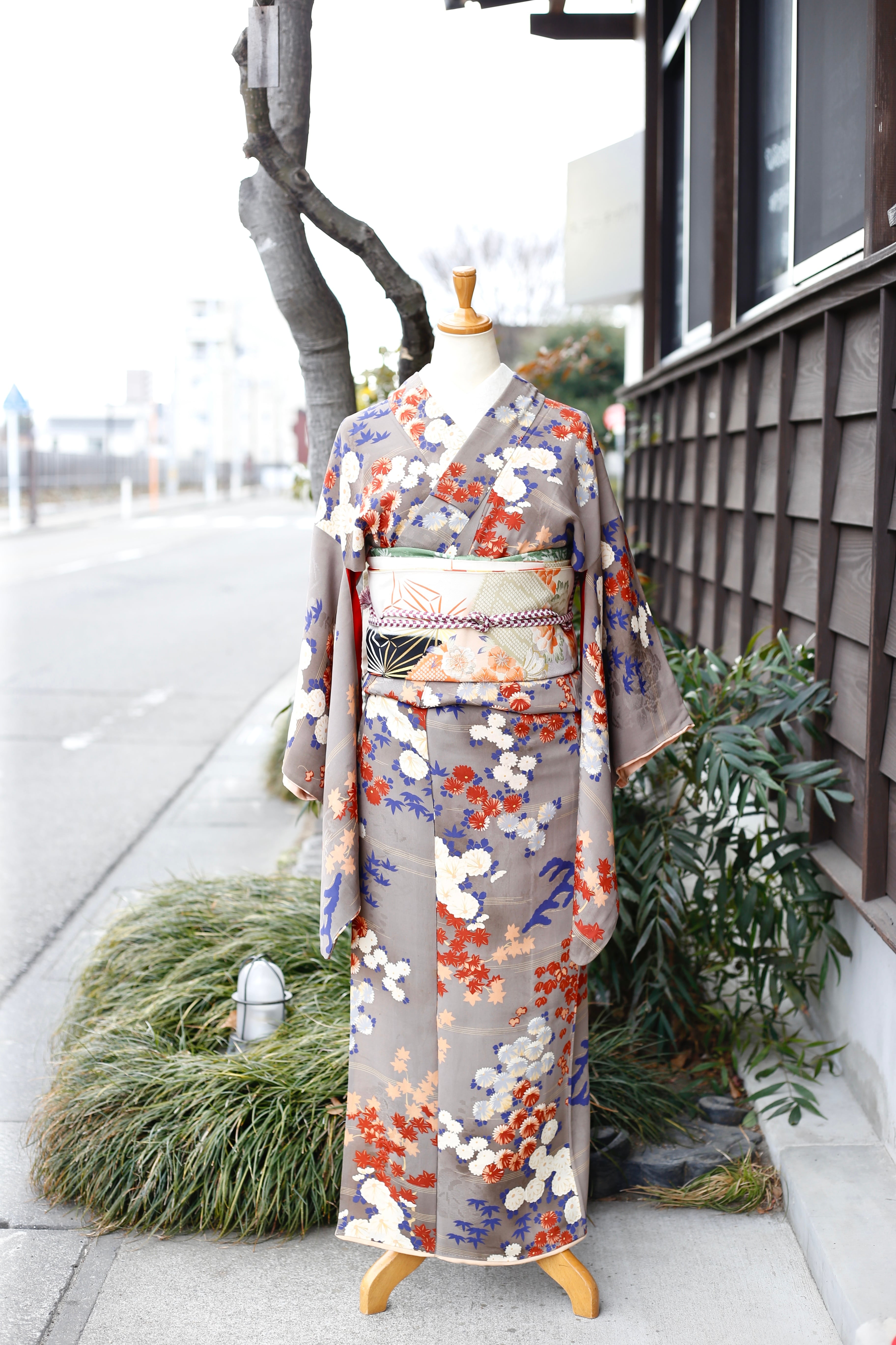 〈アンティーク着物〉グレージュ 菊 綸子