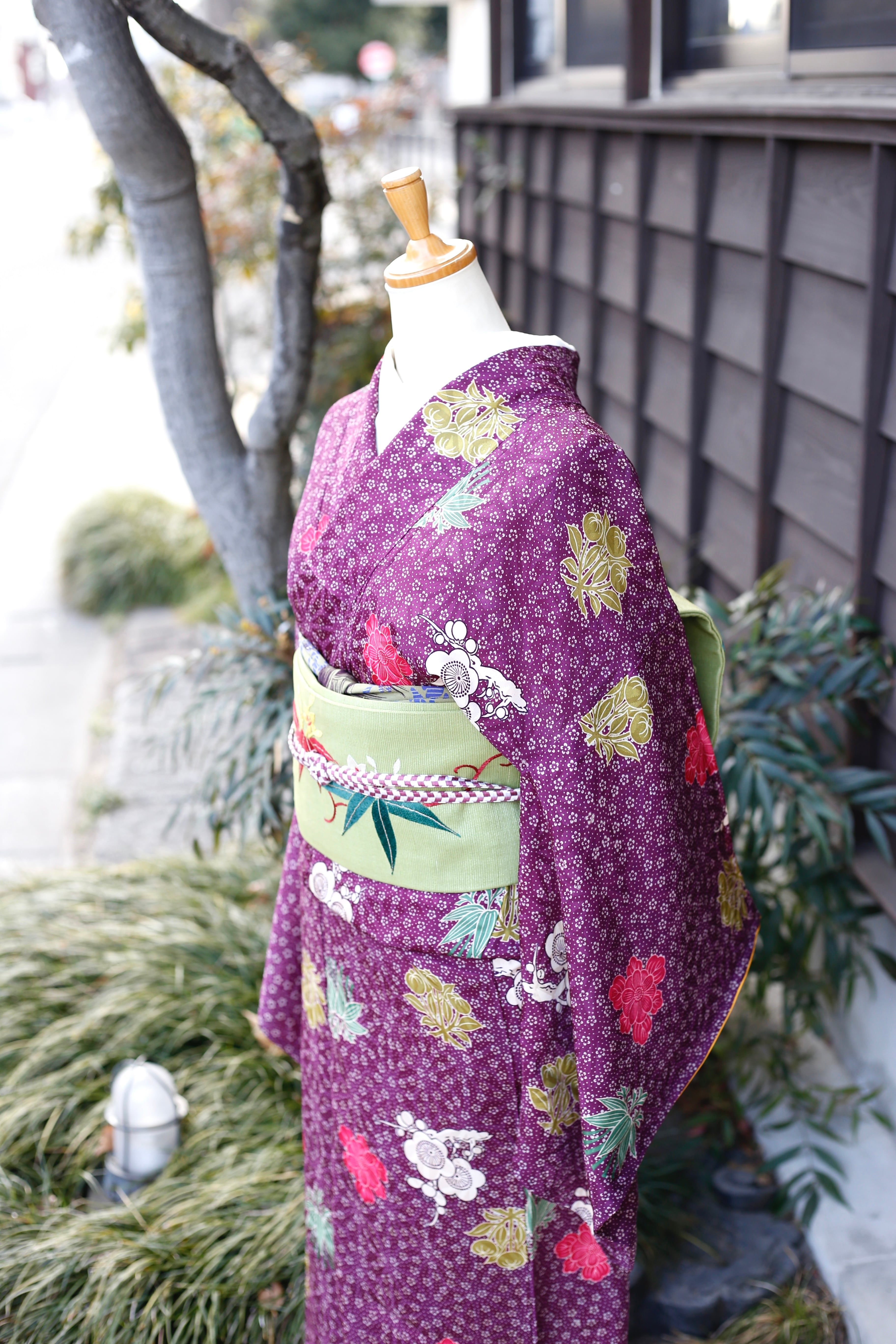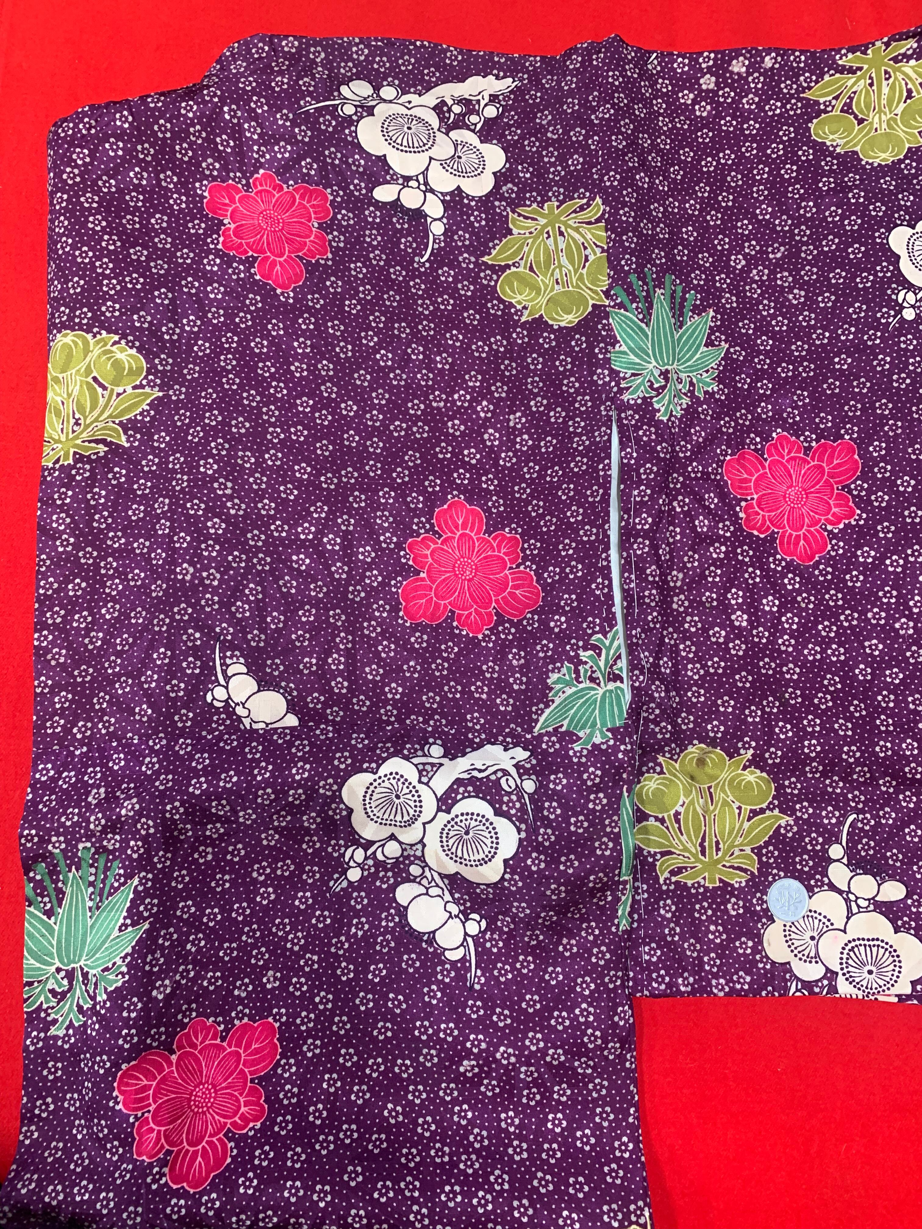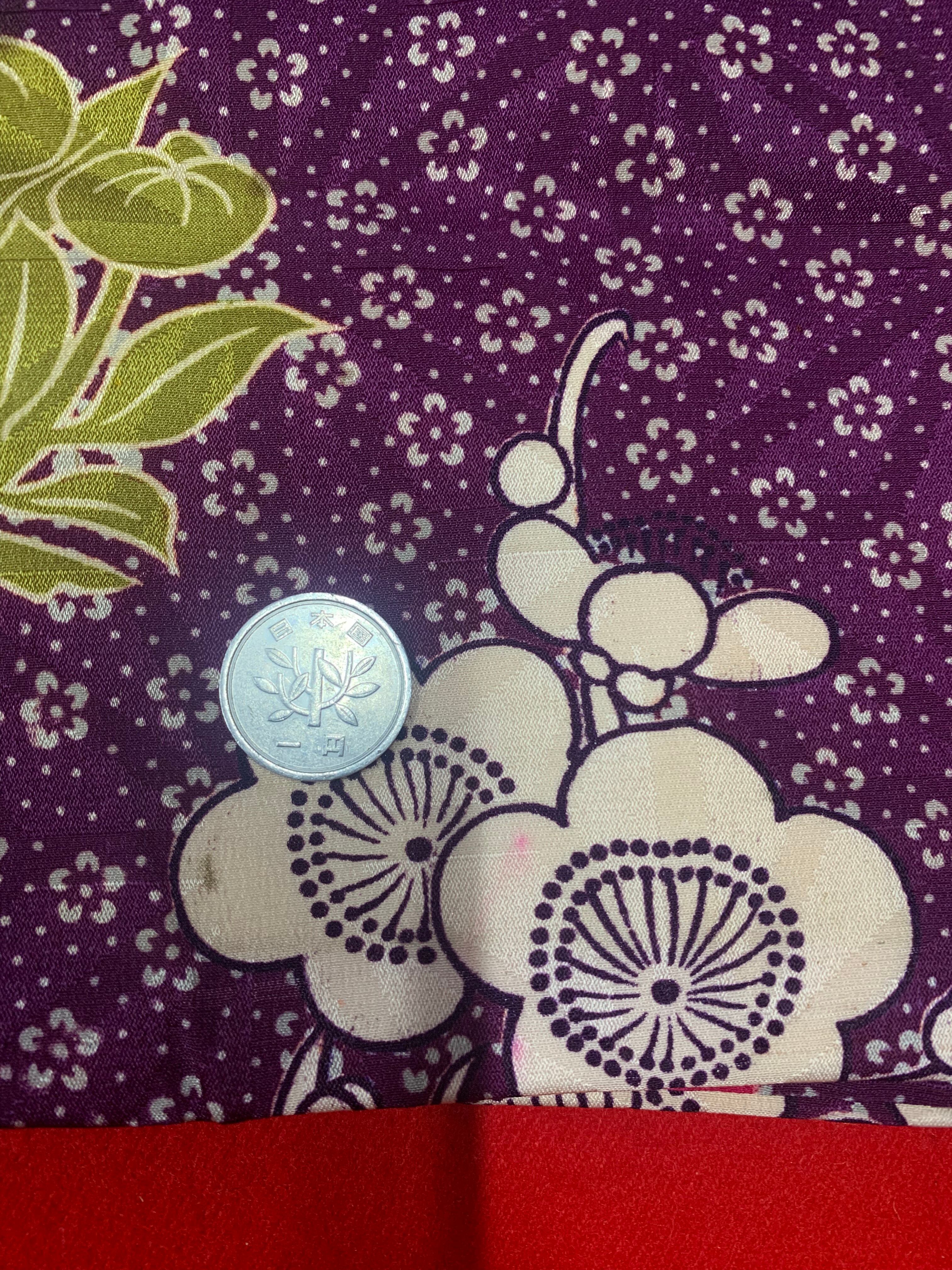 〈アンティーク着物〉紫 梅 笹 菊 麻の葉の綸子