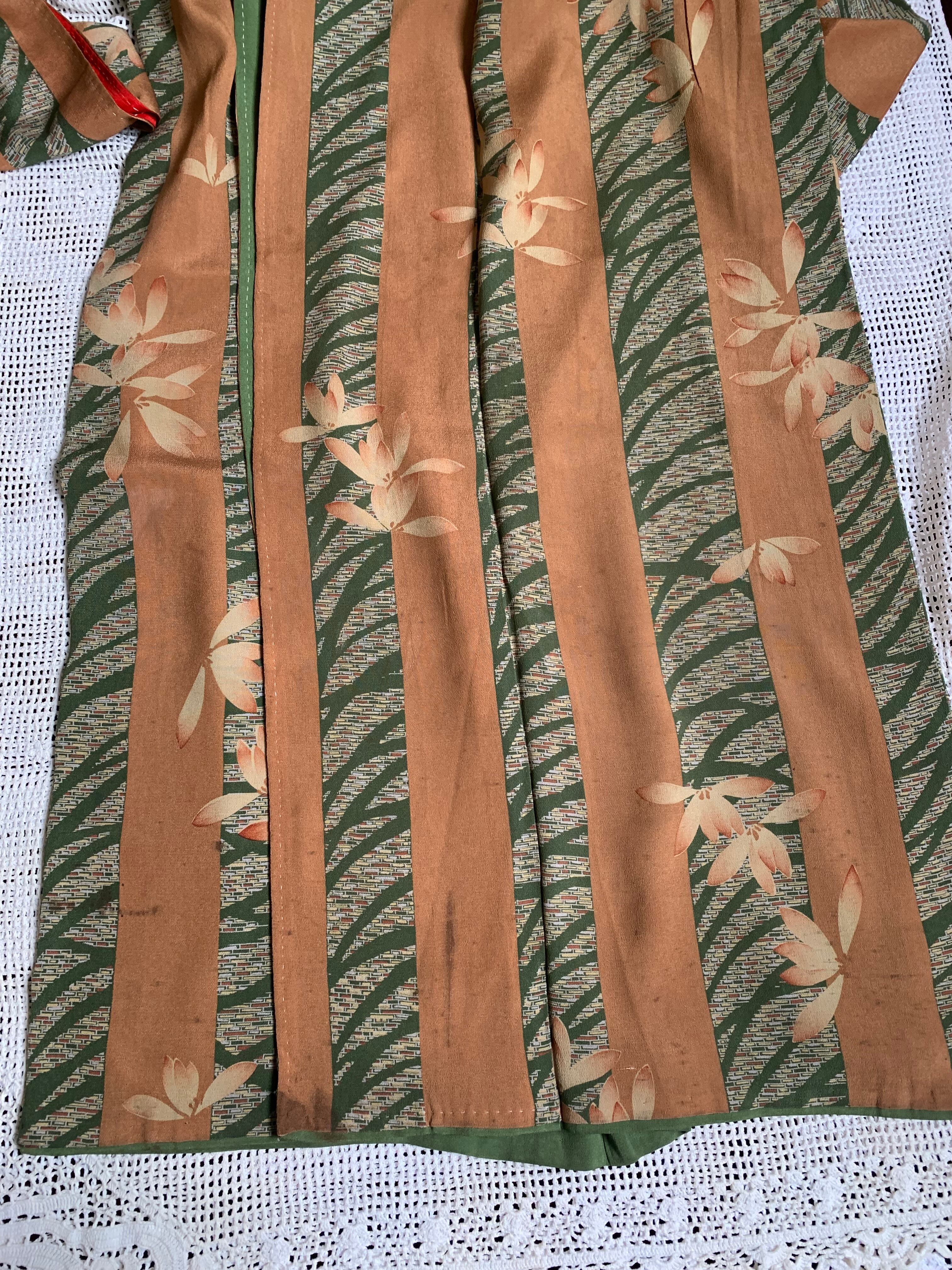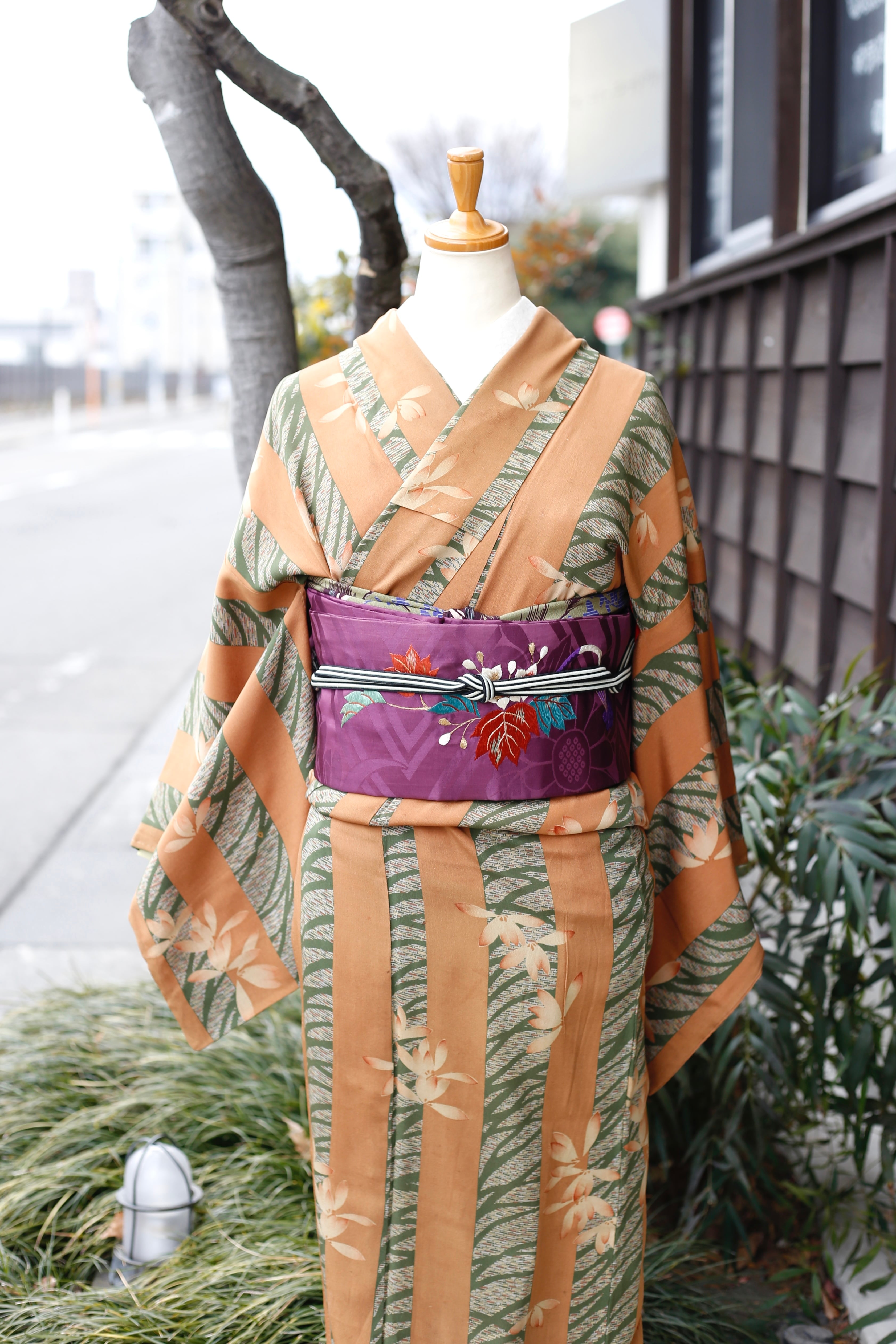 〈アンティーク着物〉ブラウン 抹茶 縞 花?