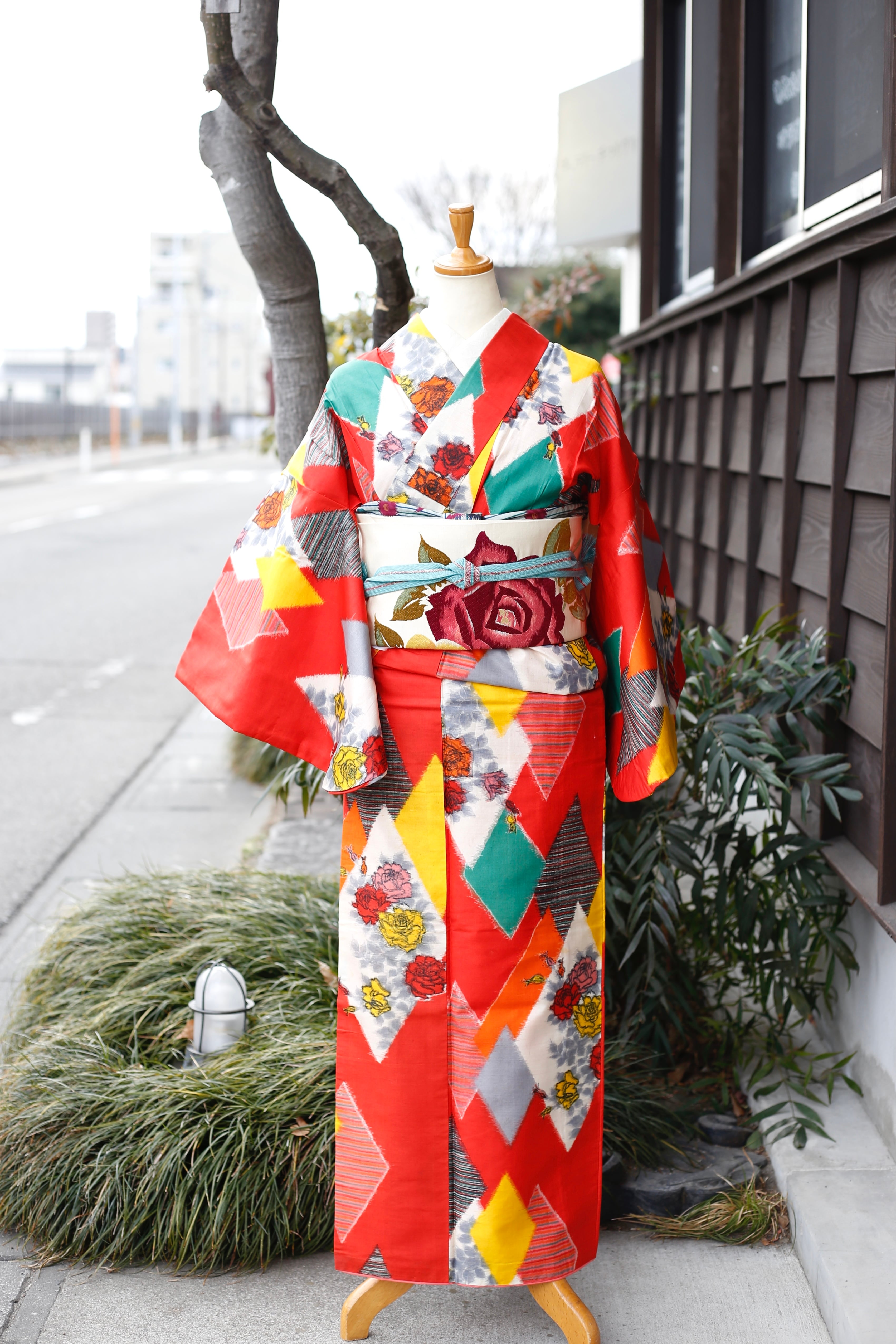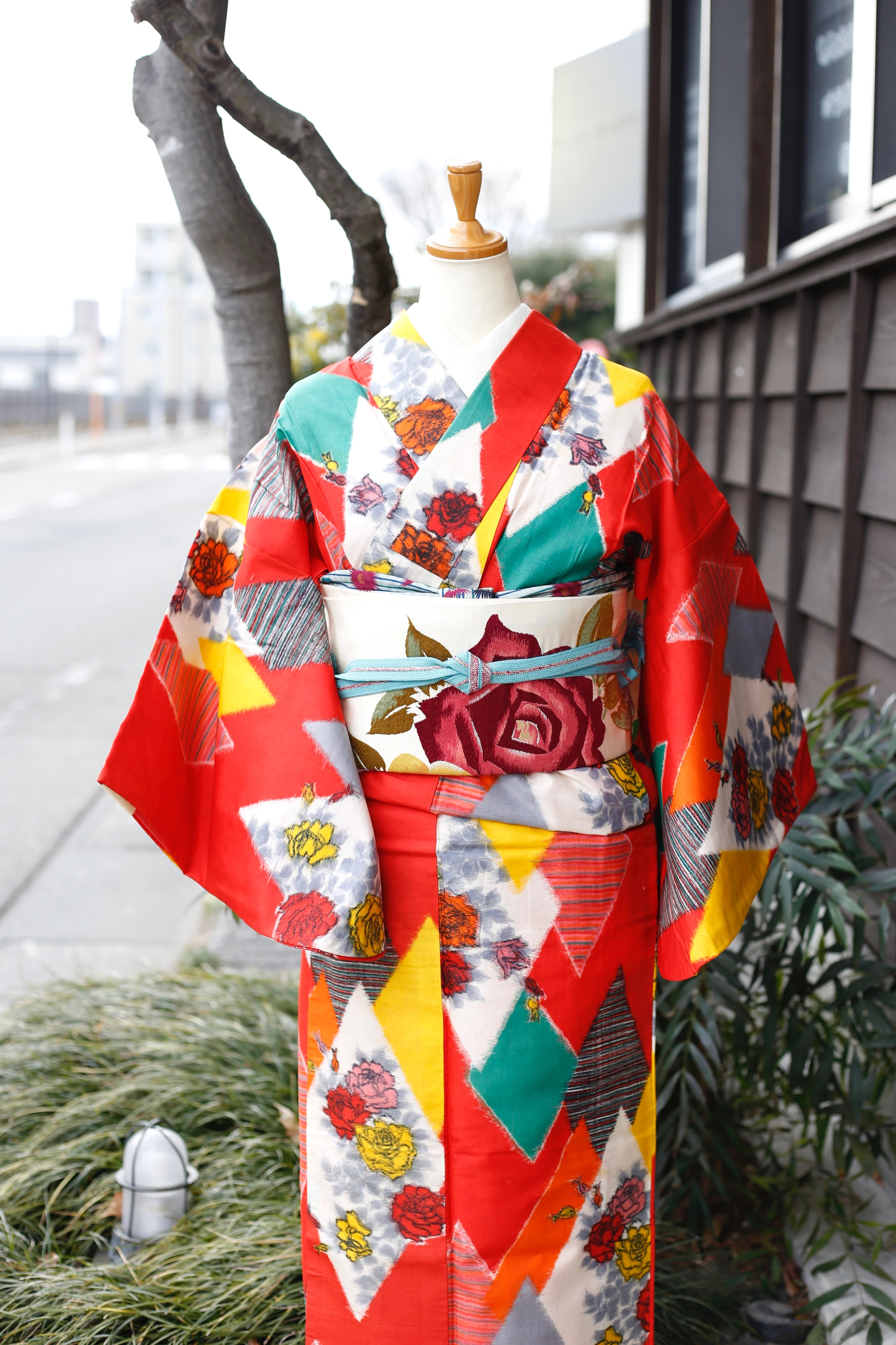 〈アンティーク着物〉銘仙 薔薇 ダイヤ 赤