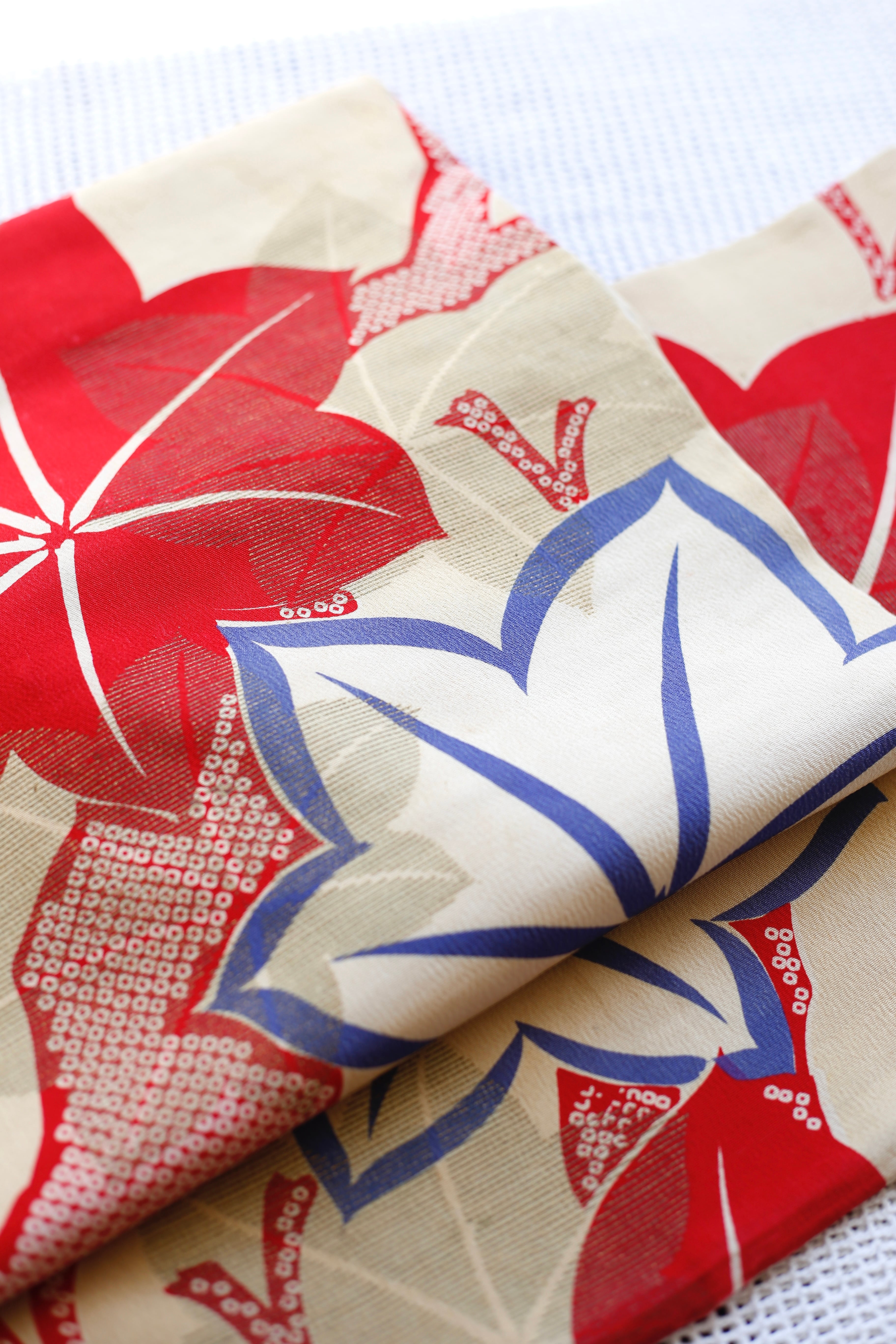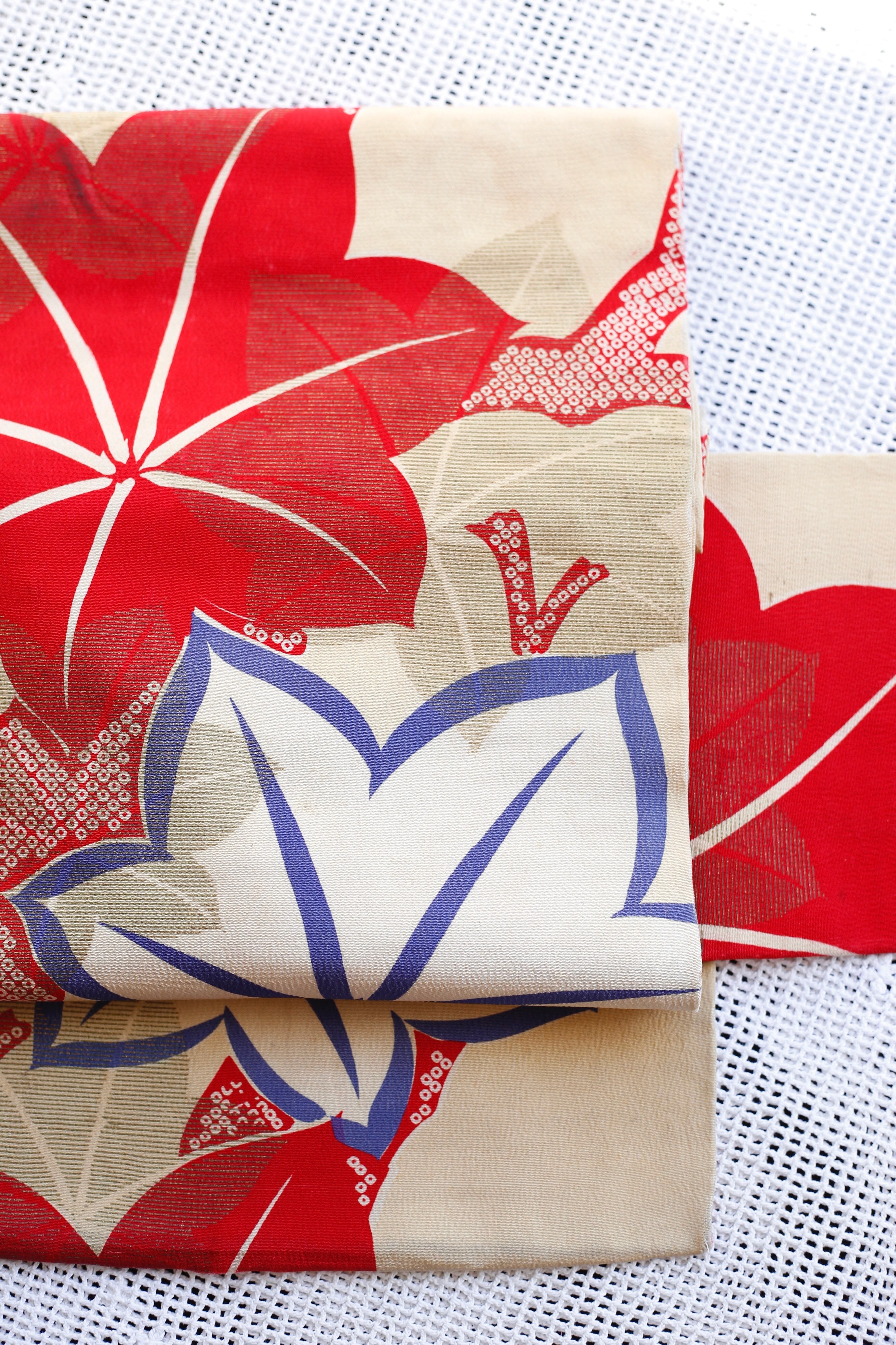 〈名古屋帯〉楓 カエデ 秋柄 赤 青 アイボリー