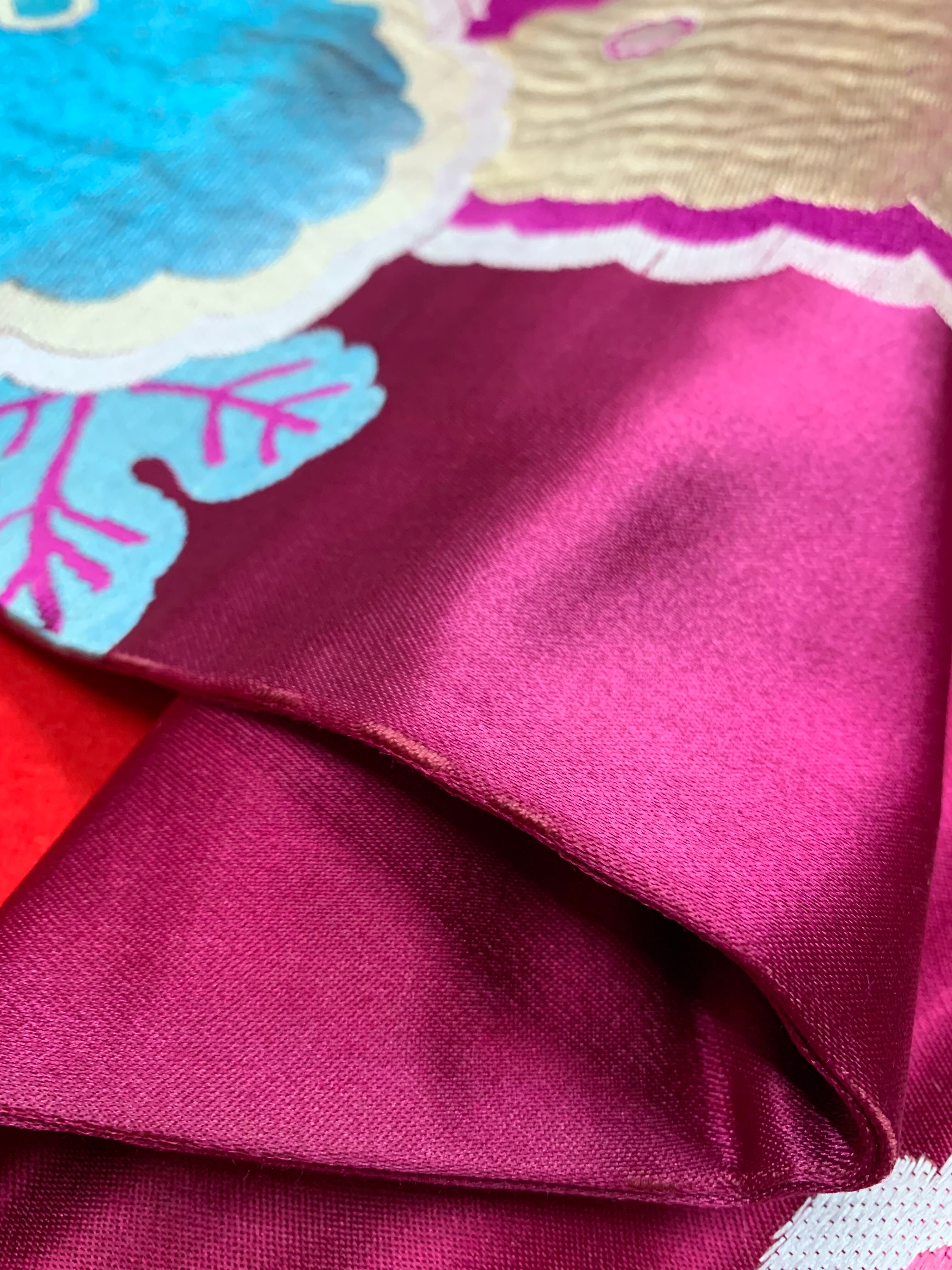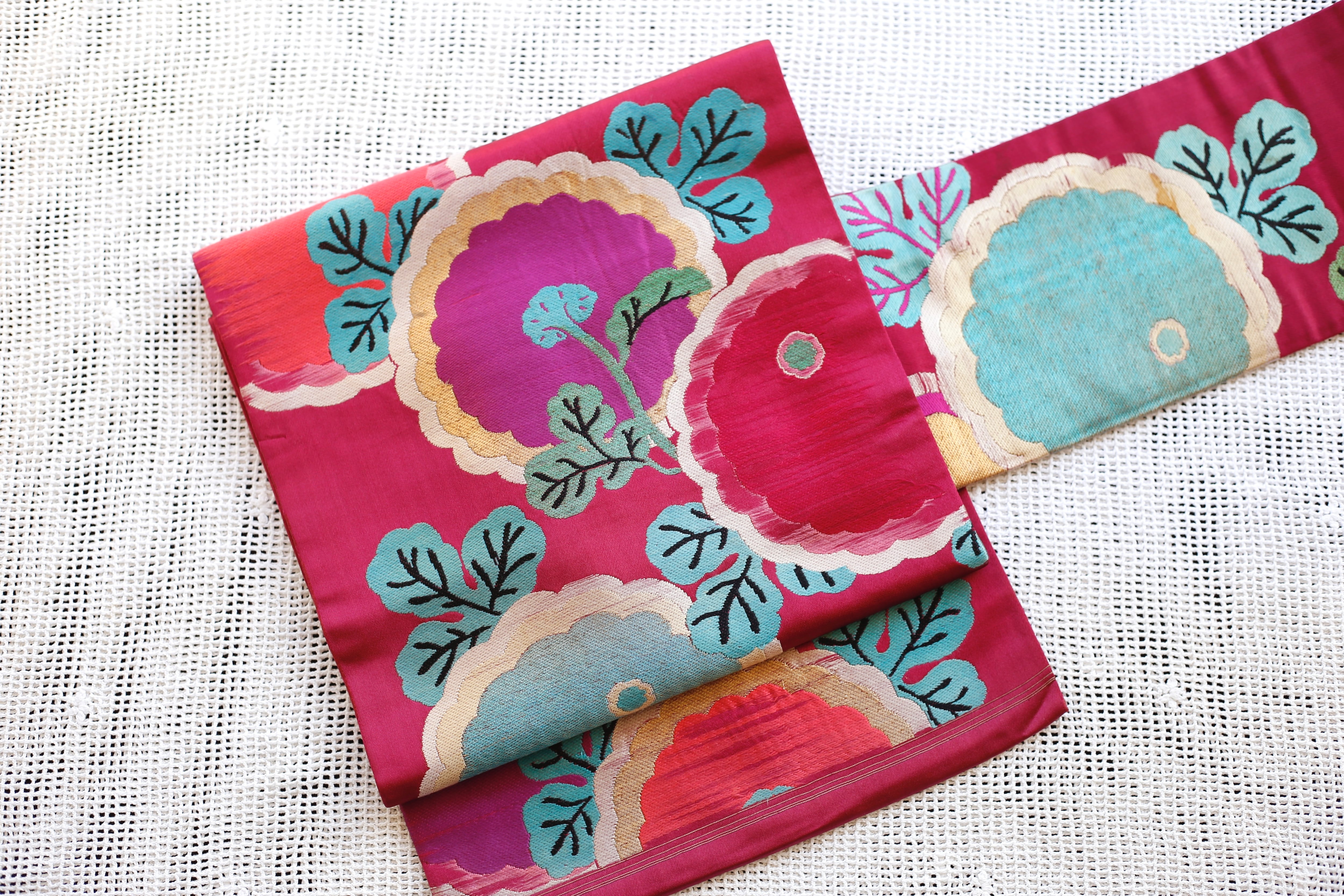 〈名古屋帯〉万寿菊 ピンク ブルー 繻子