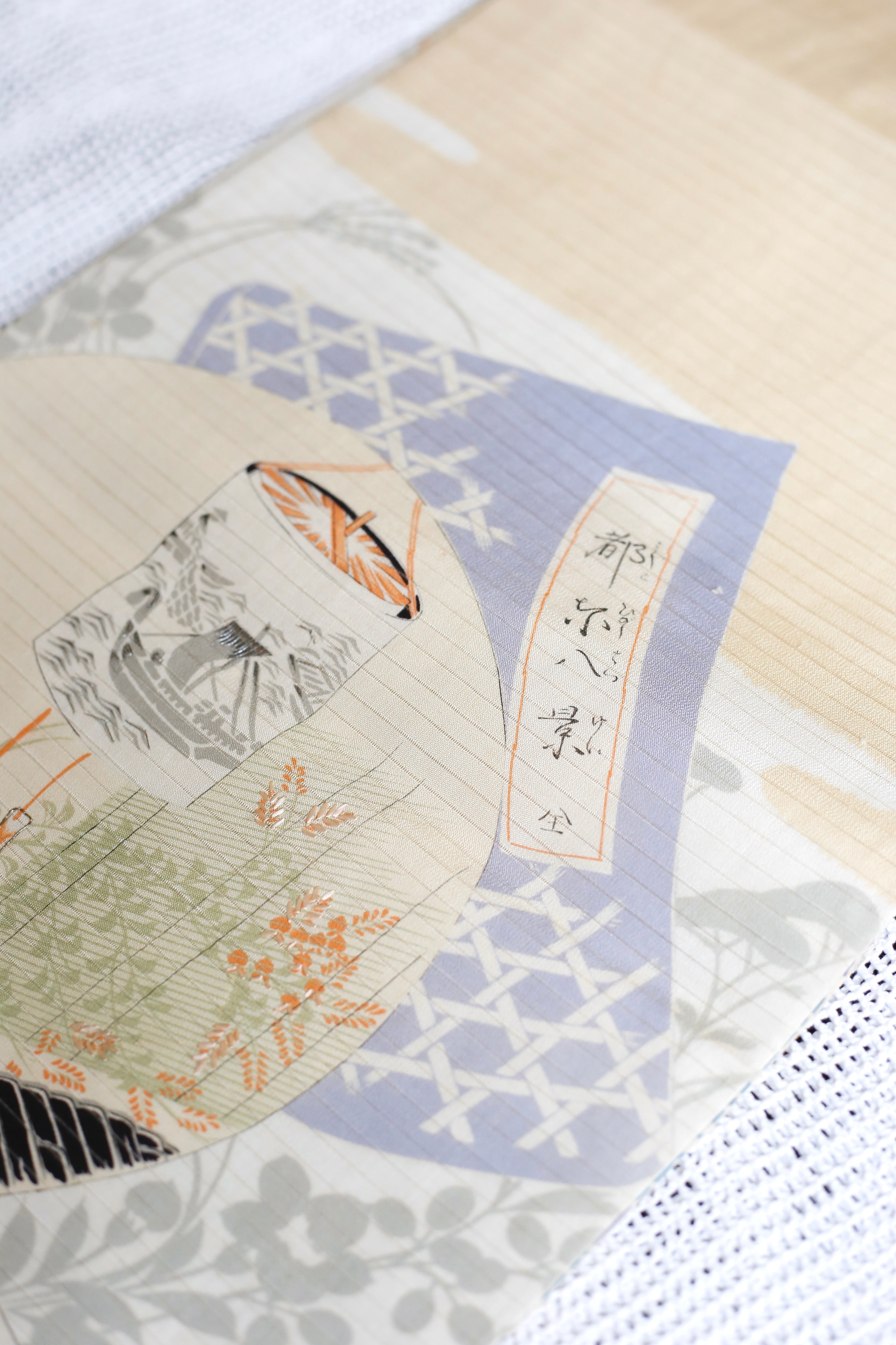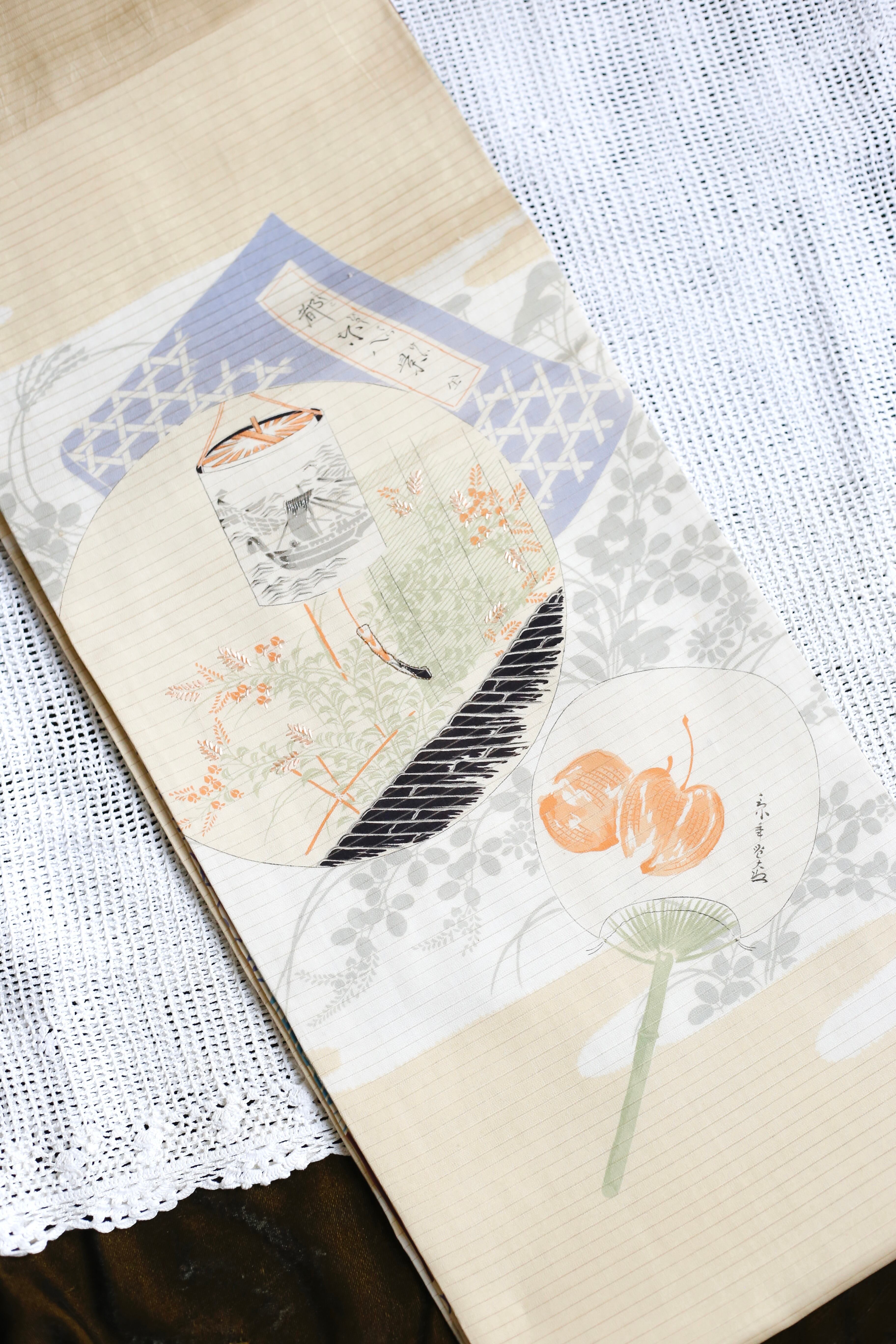 〈昼夜帯〉うちわに鬼灯 ギザギザ ブルー 片面夏帯